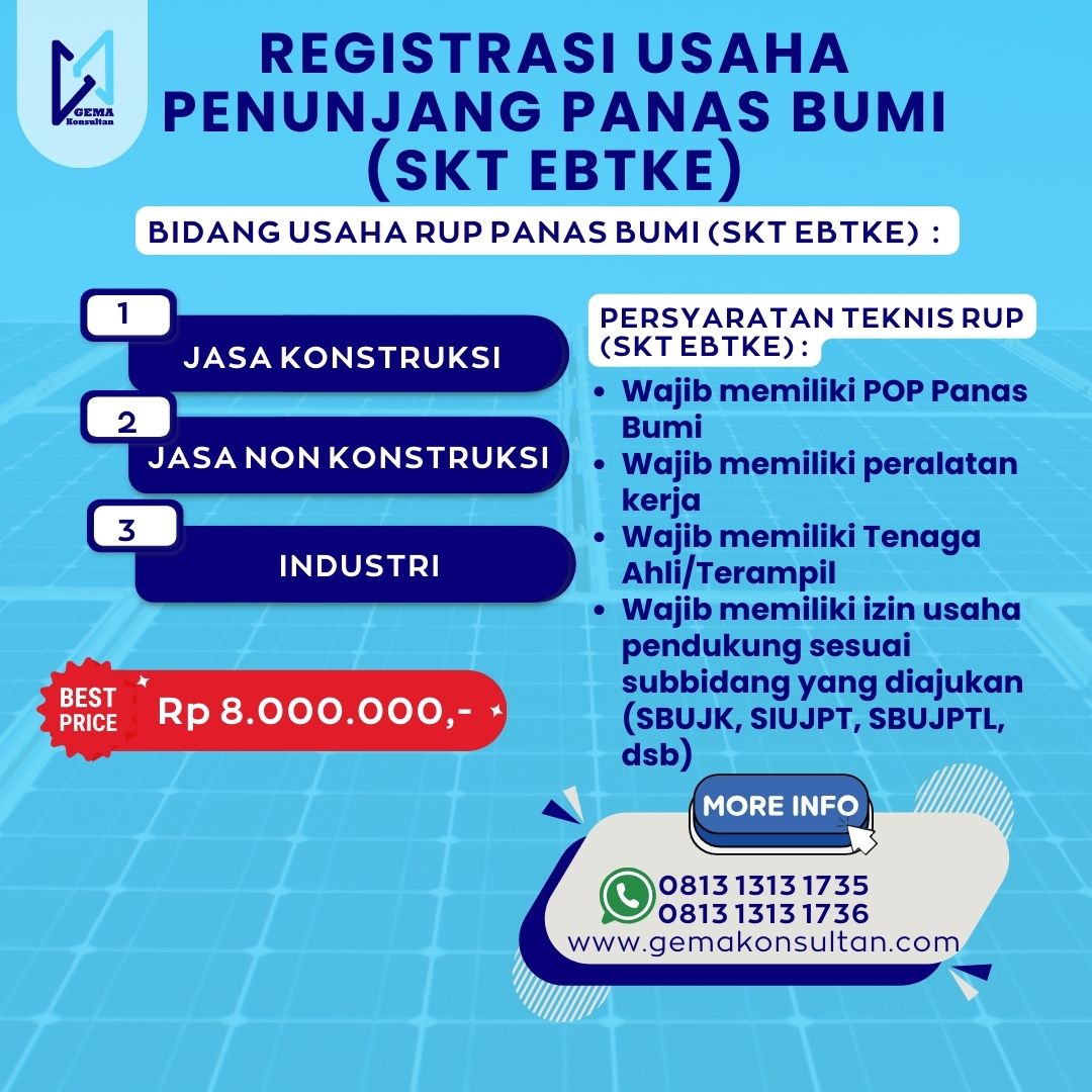 SKT EBTKE / PANAS BUMI adalah Registrasi Usaha Penunjang Panas Bumi untuk kegiatan usaha penunjang panas bumi